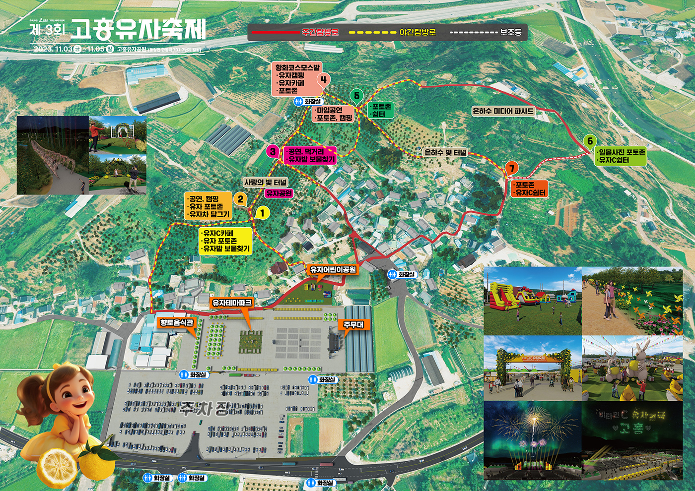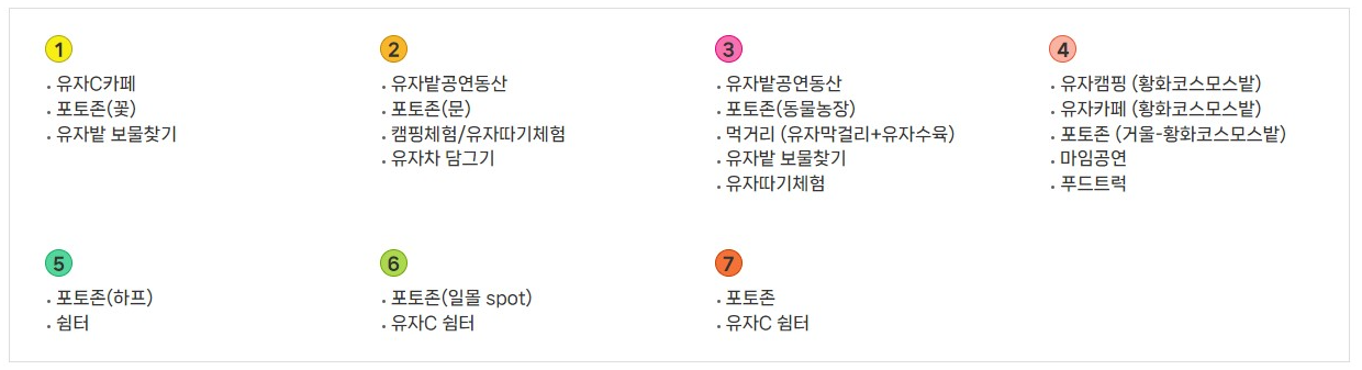 - 유유자적 유자길 : 유자밭 캠핑체험, 유자밭 light art, 유자밭 보물찾기 play, 유자밭 먹거리
