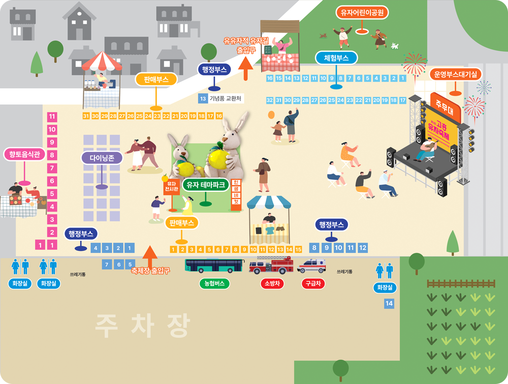 - 전시행사 : 유자전시관, 유자테마파크, 유자마을 골목벽화