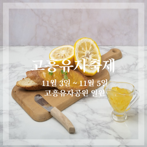 제3회 고흥 유자 축제가 고흥군 풍양면 한동리 701-7번지 일원에서 개최됩니다. 과일 축제에서 힐링 축제로 위상을 정립하고자 합성비타민이 아닌 천연 비타민C로서 대한민국 대표 축제로 브랜드화하고 자연이 만든 황금빛, 시간이 만든 비타민C 유자와 빛나는 야간 경관이 쏟아지는 아름다운 축제가 될 것입니다. 11월 3일부터 11월 5일 3일간의 일정으로 유자 공원 일원 및 축제장에서 다양하고 풍성한 볼거리로 관람객들을 만날 예정입니다.