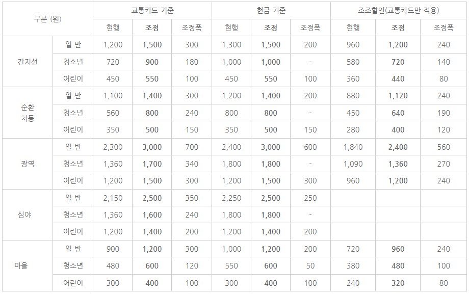 조정되는 버스 요금은 일반 카드 기준으로 시내버스는 간·지선 1500원, 순환·차등 1400원, 광역 3000원, 심야 2500원으로 조정되며, 마을버스는 1200원으로 조정됩니다. 인상 폭은 어린이 마을버스 요금, 기존 300원에서 400원으로 100원의 가장 낮은 조정폭을 보였고 가장 높은 인상 요금은 광역버스 일반 요금, 기존 2300원에서 3000원으로 700원이나 인상되었습니다.