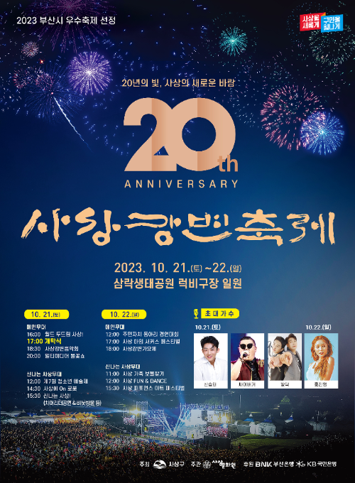 부산시 우수축제로 선정된 사상 강변 축제가 20주년을 기념해 더욱 다양해진 프로그램으로 구민들을 만나게 됩니다.
