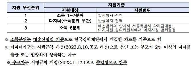 3순위는 소득 8분위로 예산 범위 안에서 서울시 학자금대출 이자 지원 심의위원회에서