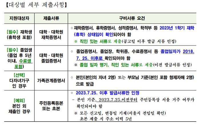 필수 구비서류로는 대학(원) 재학 및 졸업증명서, 가족관계증명서( 다자녀인 경우 제출)