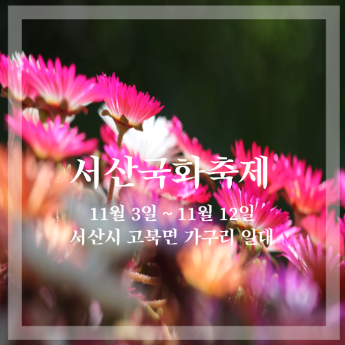 오는 11월 3일부터 11월 12일까지 10일간의 일정으로 충남 서산에서 '서산국화축제'가 개최됩니다. 축제장 주변 약 500여 대를 수용할 수 있는 무료 주차장을 이용하실 수 있습니다. 잘 익은 사과나무와 어우러져 풍요로운 늦가을 정취를 만끽할 수 있는 경관 연출을 비롯해 국화 터널, 대형 하트 등의 대형 국화 작품과 다양한 국화 분재, 이색적인 국화 조형물 등을 전시합니다. 또한 지역 농민들이 직접 재배한 농산물 직거래 장터와 먹거리 장터, 체험 부스 운영 등 다양한 볼거리와 즐길 거리로 도시와 농촌이 화합하고 어우러질 수 있는 최고의 가을 축제입니다.