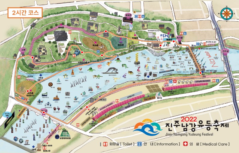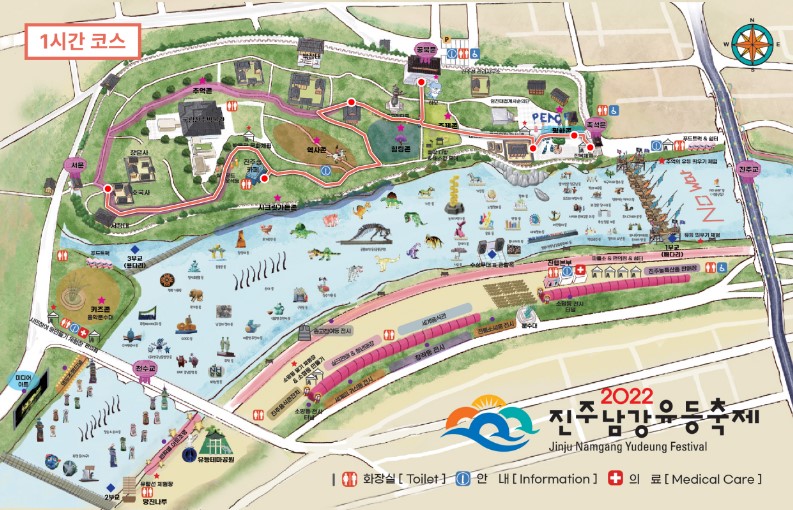 망경동둔치 (천년광장아래) 배다리 (1 부교) - 촉석문 - 영남포정사 - 진주성 포루 - 호국사 - 진주성카페 (휴식) - 어다리 (3 부교) - 음악분수대 - 용다리 (2 부교) - 유등테마공원 - 망경동둔치 (소망등 터널과 체험행사) - 망경동둔치(천년광장아래)