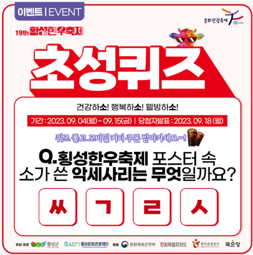 횡성 한우 축제 일정이 공개되었습니다. 올해 열리는 축제들 규모가 전반적으로 역대급 스케일을 많이 강조하는데요, 횡성한우 축제 역시 작년보다 볼거리, 먹을거리, 즐길 거리를 풍성하게 준비 중이라고 합니다. 횡성한우축제 공식 인스타그램 계정을 팔로우한 후 이벤트에 참가하면 커피 쿠폰을 받을 수 있는 기회도 있다고 하니 지금부터 알아보겠습니다.